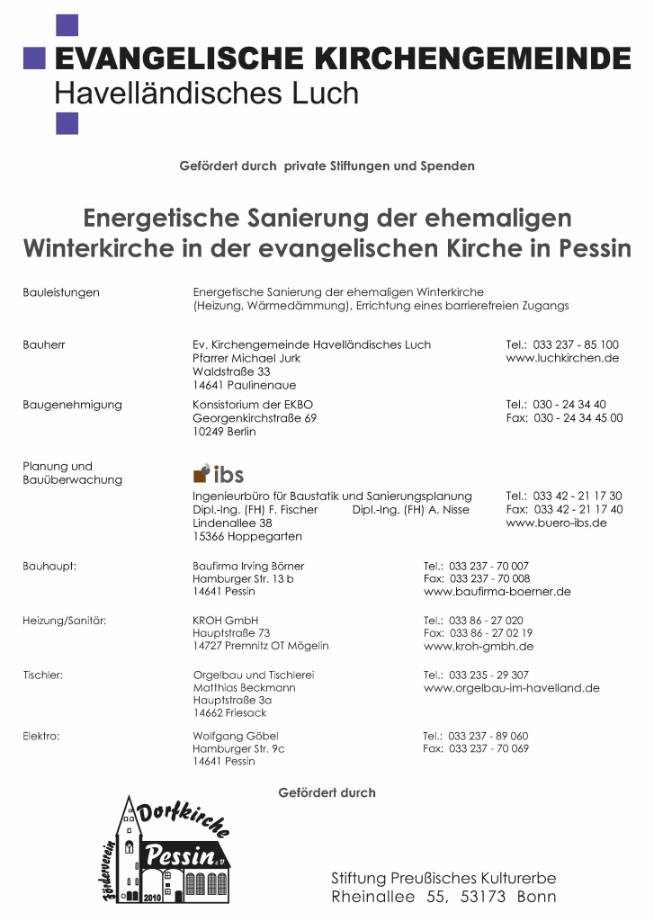 Die Baumaßnahme beinhaltet das Projekt: Versorgungstrakt (Küche und Toilette) des Fördervereins samt Wasser- und Abwasserversorgung sowie ein Zugang zum Turm, somit kommt die Gemeinde ihrem Ziel zur Nutzung der Kirche als Gemeindetreffpunkt sowie als Radfahrerkirche am Havelland-Radweg ein großes Stück näher.